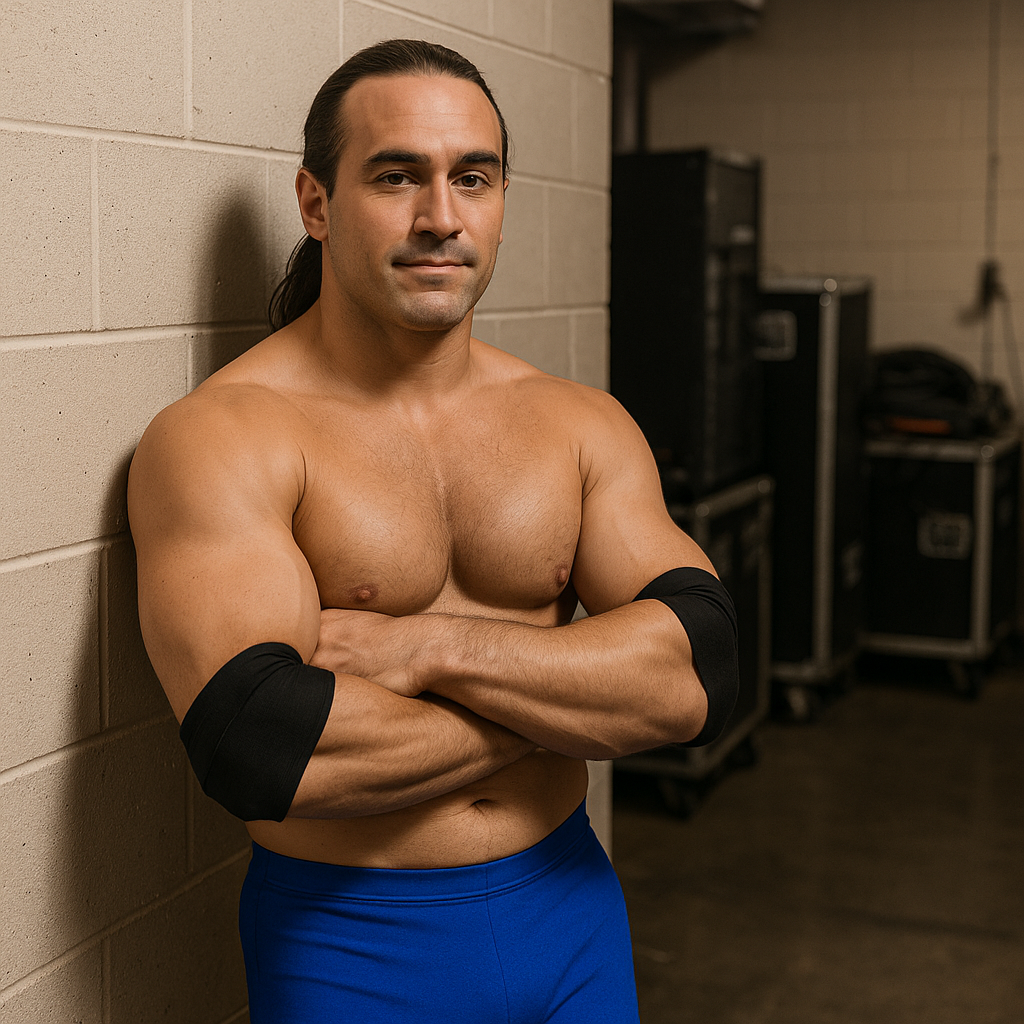 He steps out, cold and calculating, the championship belt glistening across his shoulder. The champion moves slowly, deliberately, circling the ring like a predator stalking its territory. He finally unclasps his title and hands it to the timekeeper’s table without even looking at them.