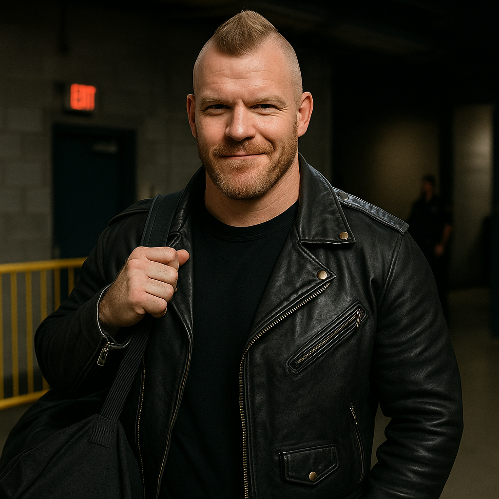 Bodies tumble in a knot of limbs and leather. A belt spins across the canvas. A masked grin flashes, here and gone. The crowd surges like a wave breaking.