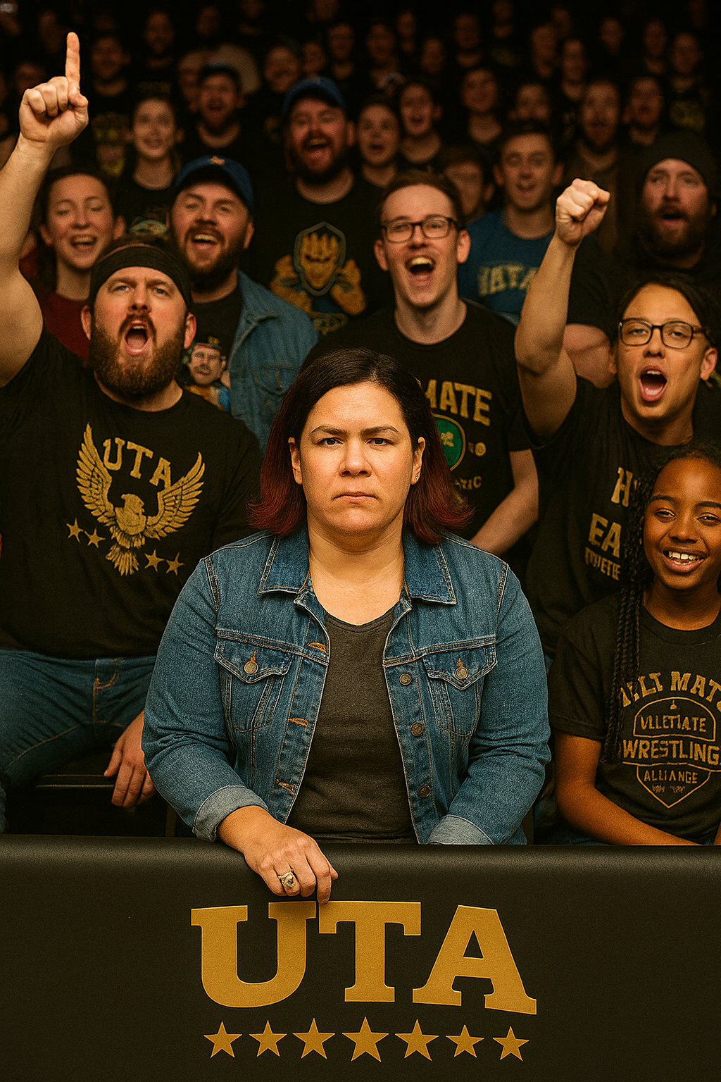 The crowd ERUPTS as Hardcore Sandy — the newest UTA Hall of Fame inductee — vaults over the barricade! She’s in street clothes, but her eyes are fire. Standing tall, arms folded, she glares down at Amy like a hunter who’s cornered her prey.